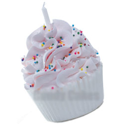 The Birthday Cupcake Bath Bomb in warm vanilla sugar,has rainbow sprinkles and a birthday candle in a white liner.